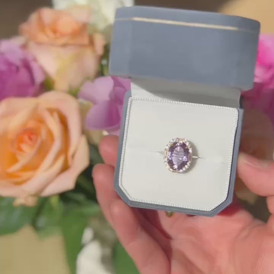 Dieser edle Ring besteht aus hochwertigem S925 Sterlingsilber und ist mit einem wunderschönen, oval geschliffenen natürlichen Amethysten (10x14 mm) besetzt. Umgeben von funkelnden Zirkoniasteinen, verleiht er Ihrem Look eine elegante Note. Der offene Ring ist individuell verstellbar und bietet hohen Tragekomfort. Mit einem Gewicht von ca. 3,85 g ist er leicht und ideal für den täglichen Gebrauch oder besondere Anlässe.