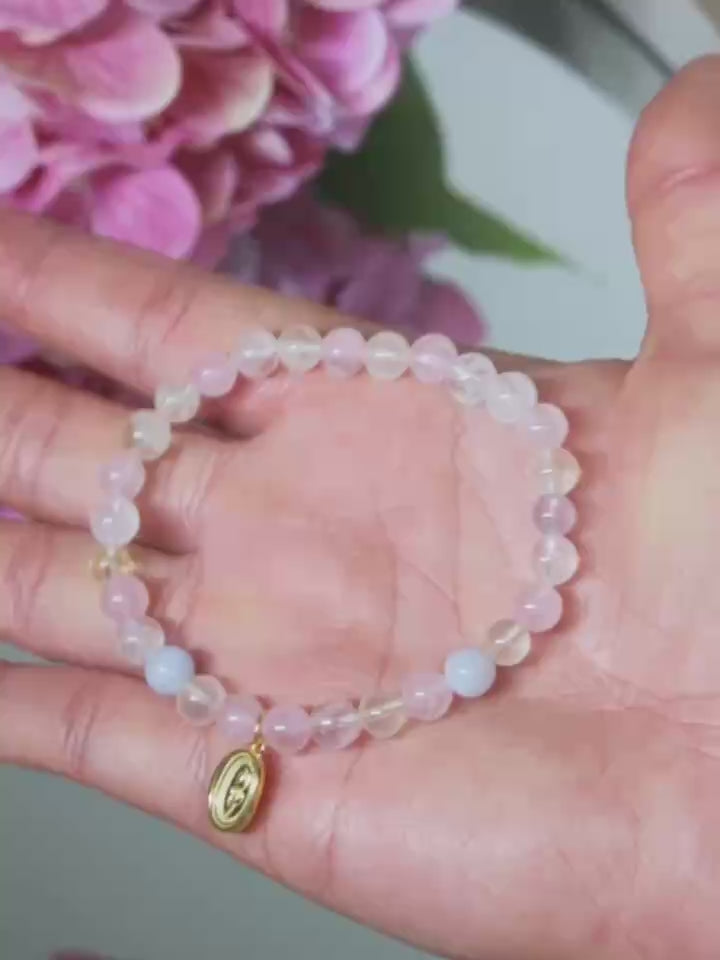 Dieses Armband ist wie ein geheimer Frühlinggarten, in dem fünf Kristalle – Aquamarin, Rosenquarz, Amethyst, Bergkristall und Citrin – harmonisch miteinander verschmelzen. Ihre Farbenpracht entfaltet sich in einem sanften Spiel von Blau, Rosa, Lila, Klarheit und Gelb, das wie ein Dopamin-Kick wirkt. Es weckt Freude, Hoffnung und positive Energie, die den Geist erfrischen und das Herz erheben.